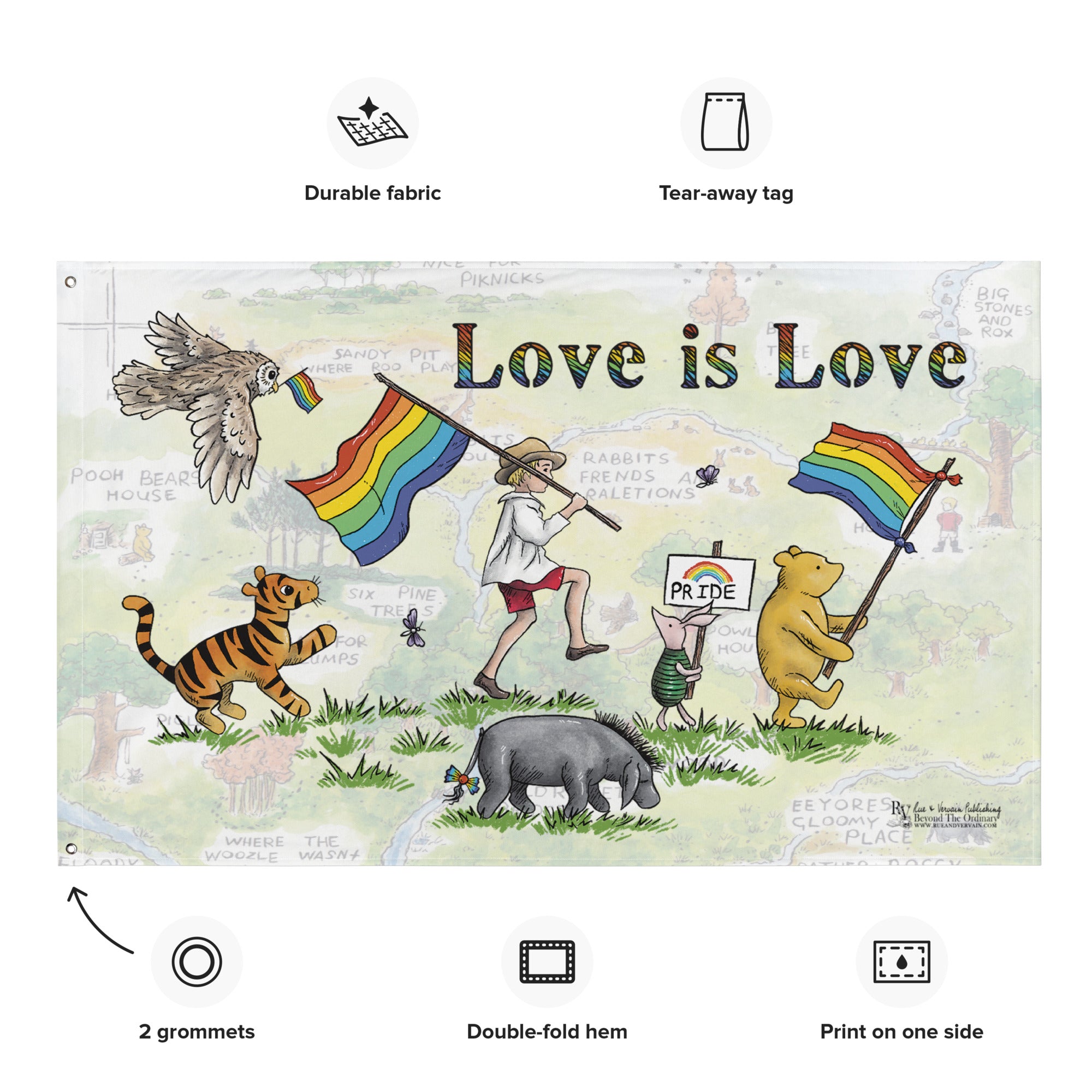 Join Pooh and all his friends as they parade through the Hundred Acre Wood, waving their Pride flags high and celebrating love in all its beautiful forms. This vibrant design captures the gang—Tigger, Piglet, Eeyore, Christopher Robin, Owl, and Pooh himself—marching together in joyful solidarity for Pride Month.